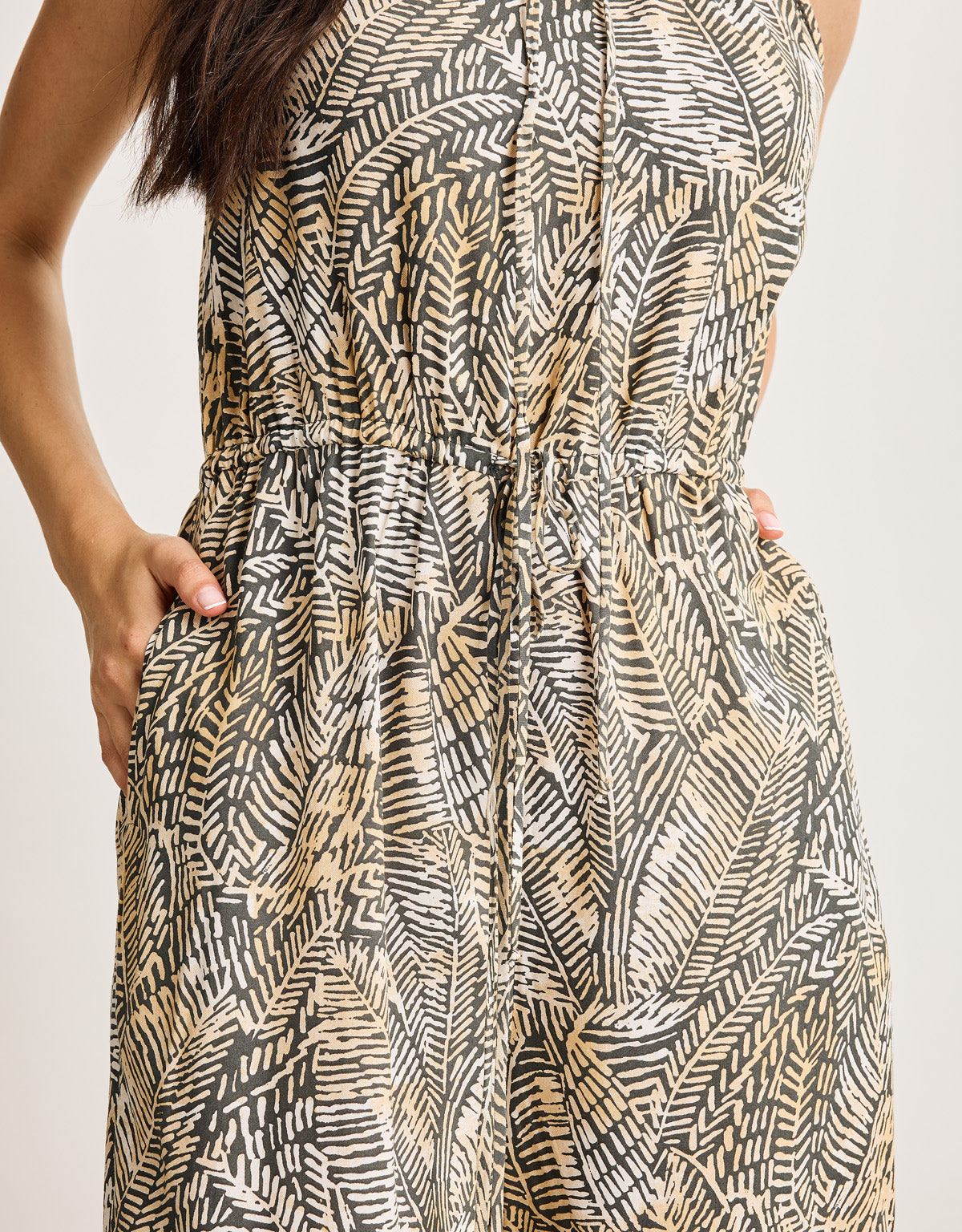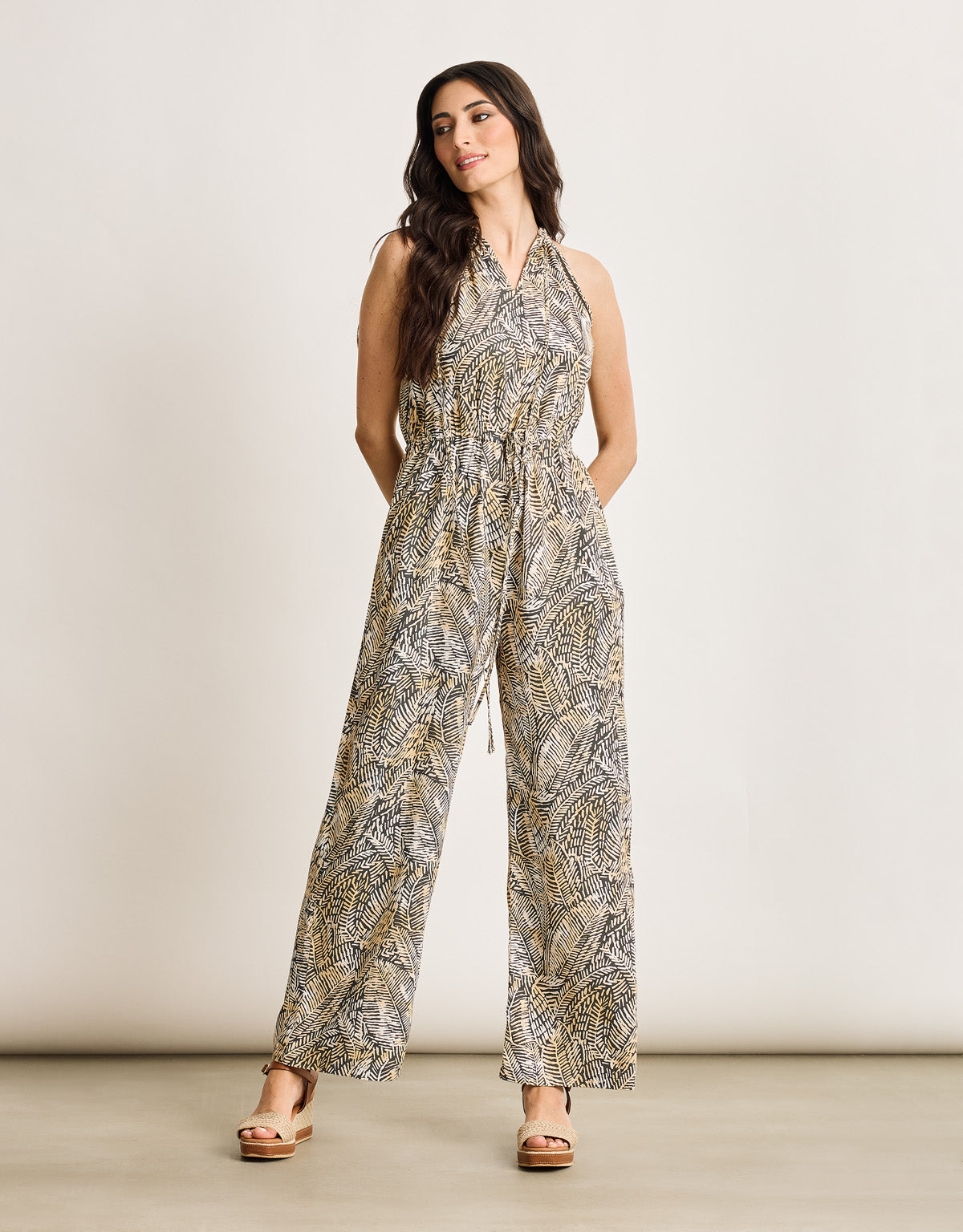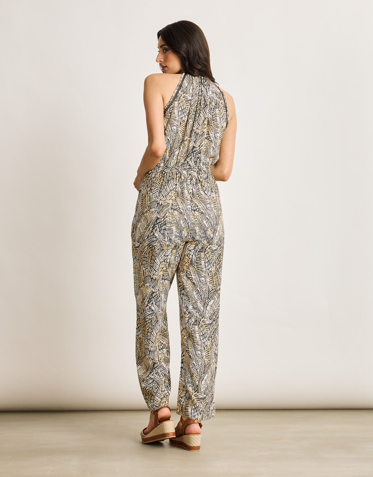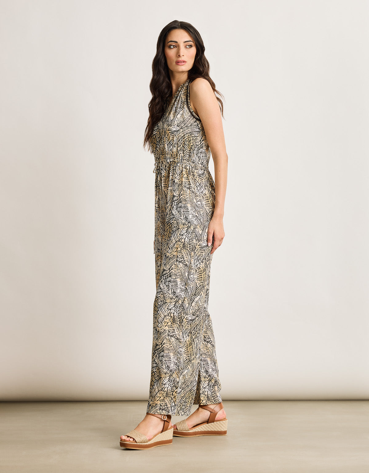 El mono largo Caliste combina comodidad y estilo con un estampado vegetal en tonos verde oscuro y arena. Con escote halter y cintura ajustable, estiliza la figura sin renunciar a la frescura.
