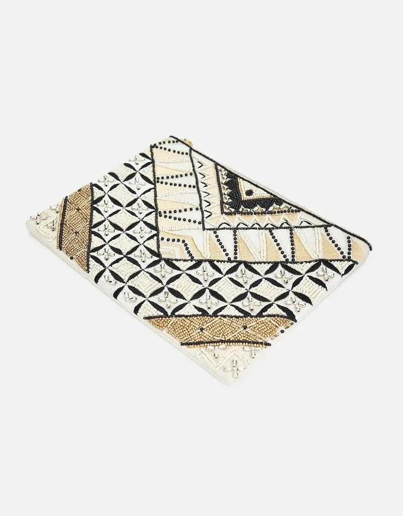 Diese schwarz-weiße Tragetasche hat genau die richtige Größe, um Ihre Accessoires bequem zu transportieren. Ihr geometrisches Design verleiht ihr einen modernen und dynamischen Touch. Sie lässt sich sowohl mit legeren als auch mit formellen Looks kombinieren. Sie ist perfekt für Sommerabende. Maße: Breite 26 cm x Höhe 19 cm.