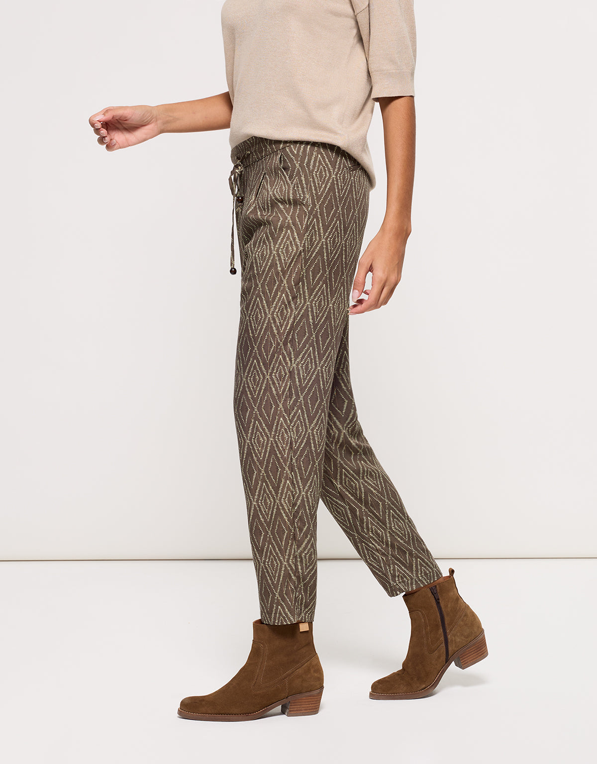 Lange Bohoela-Hose in Grün mit dezentem geometrischem Muster, das ihr einen originellen Touch verleiht. Mit elastischem Bund und verstellbarem Kordelzug für mehr Komfort und geradem Schnitt, der die Figur schlanker wirken lässt.