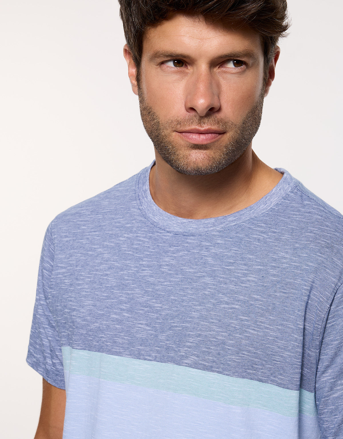 Kurzärmeliges Galosa-T-Shirt in Blau, aus 100 % Baumwolle für Weichheit und Frische bei jedem Tragen. Das Design mit Streifen in drei Farbtönen macht es zu einem vielseitigen und bequemen Kleidungsstück, ideal für lässige Looks.