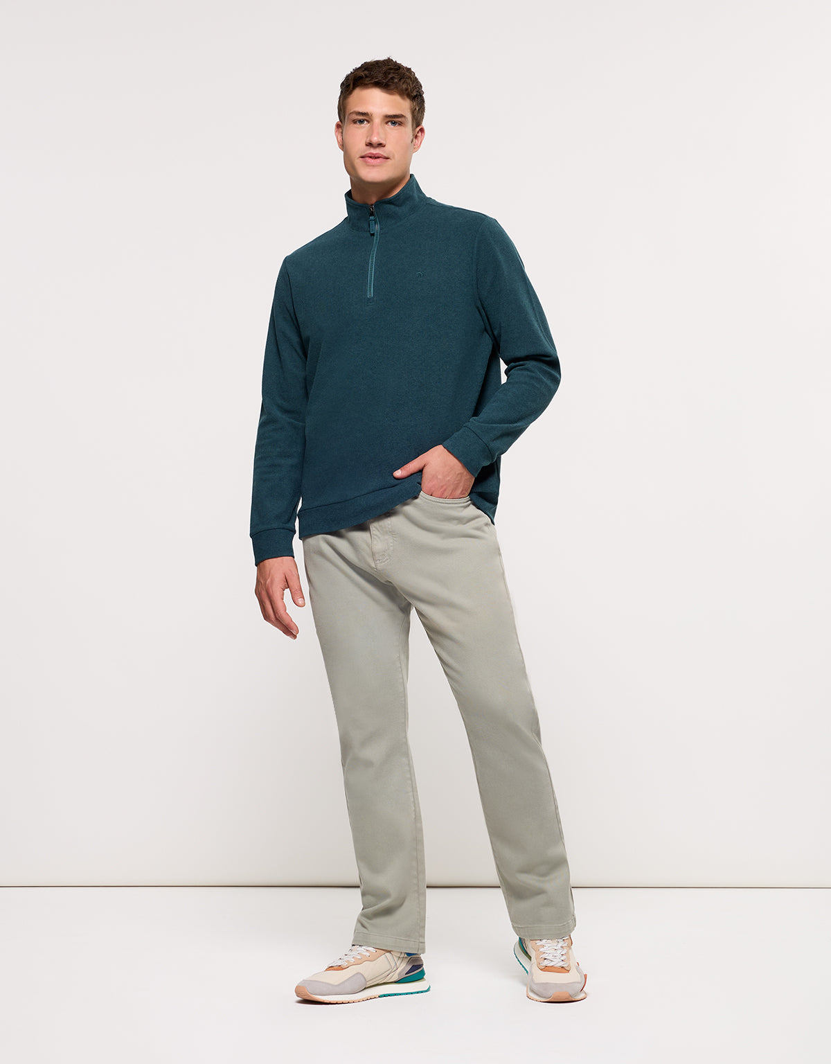 Grünes Moses-Sweatshirt aus weichem, warmem Stoff. Mit hohem Kragen, halbem Reißverschluss und elastischen Bündchen an Ärmeln und Saum für eine bequeme, moderne Passform.