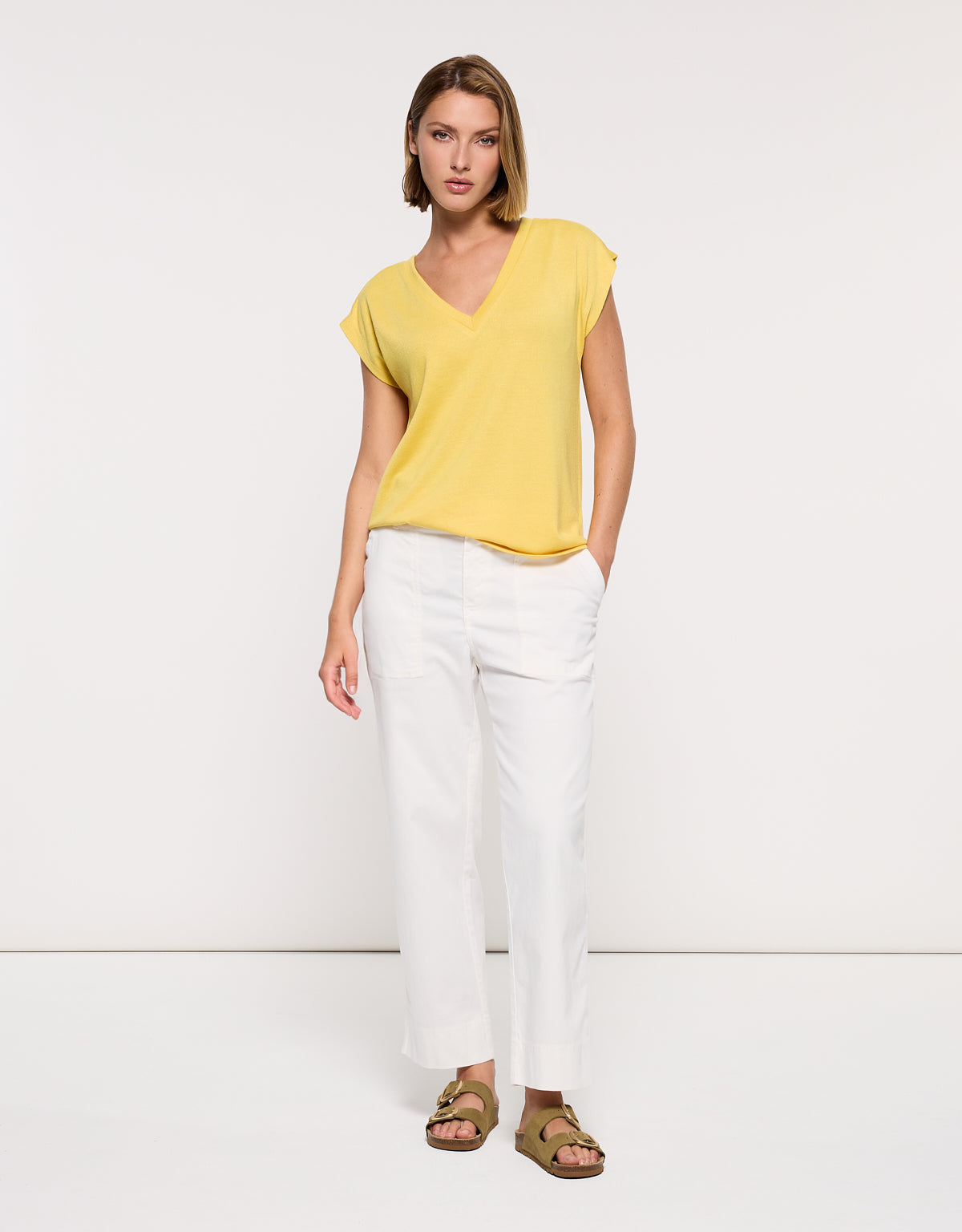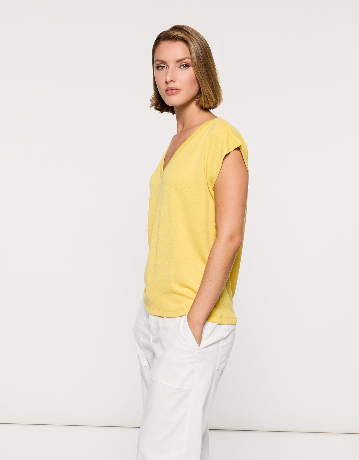 Kurzärmeliges T-Shirt Imara in Senfgelb mit vorteilhaftem V-Ausschnitt. Ideal, um Ihren saisonalen Outfits einen Hauch von Frische und Leuchtkraft zu verleihen.