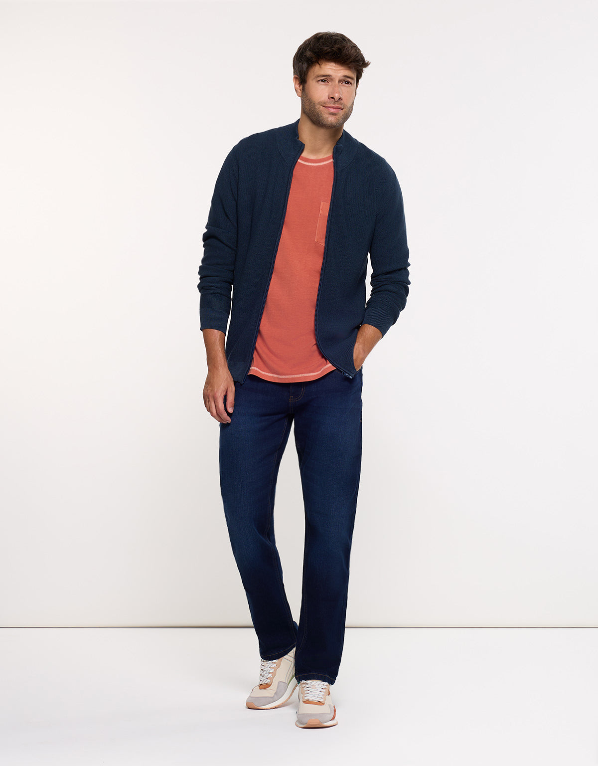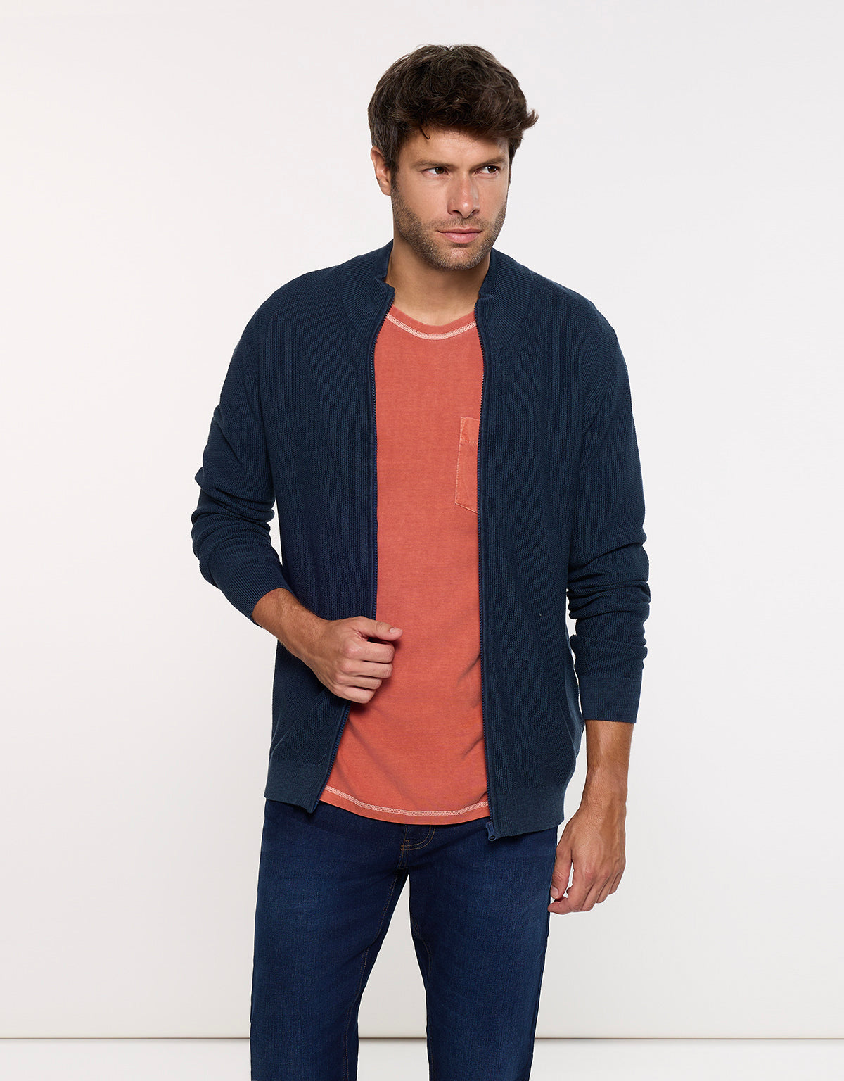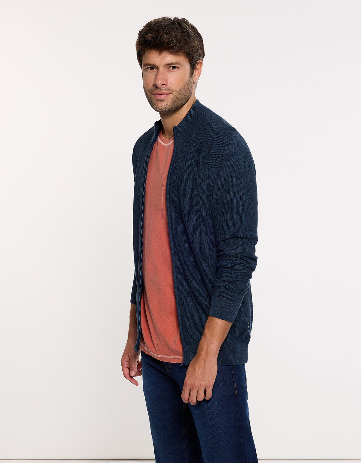 The Royal cardigan, crafted from a soft cotton blend, features a zip closure and a stand-up collar for a modern and practical touch. Its versatile design and soft-touch fabric make it ideal for layering with both casual and elegant looks.