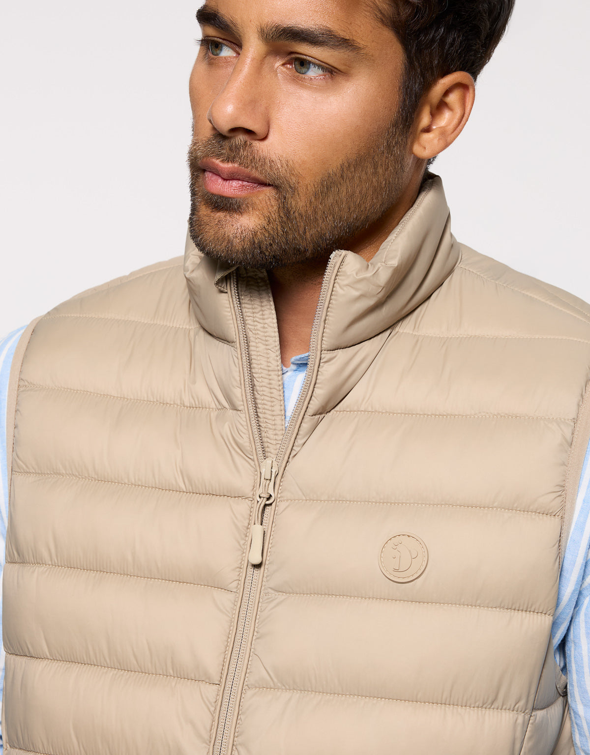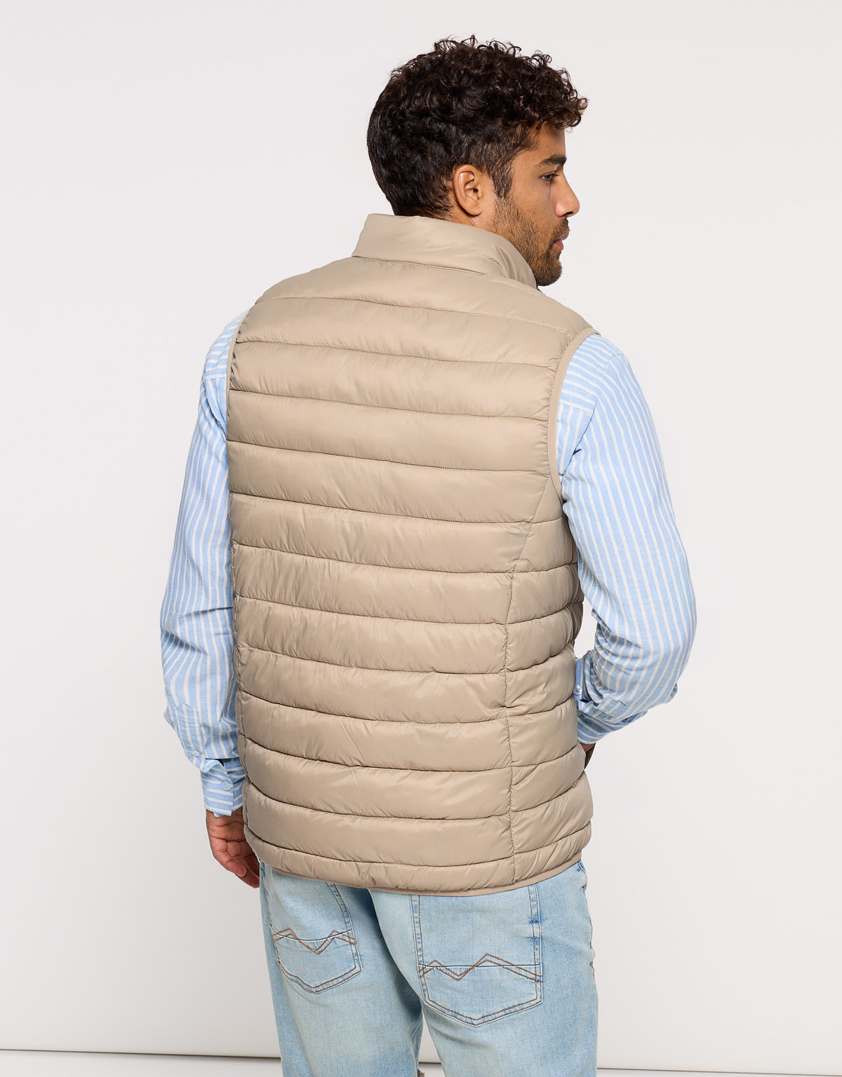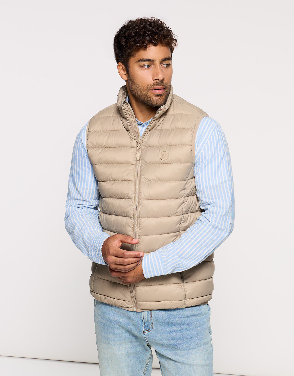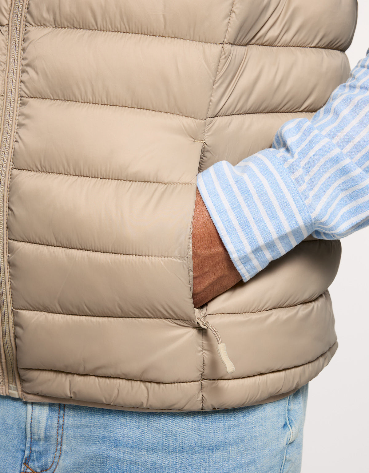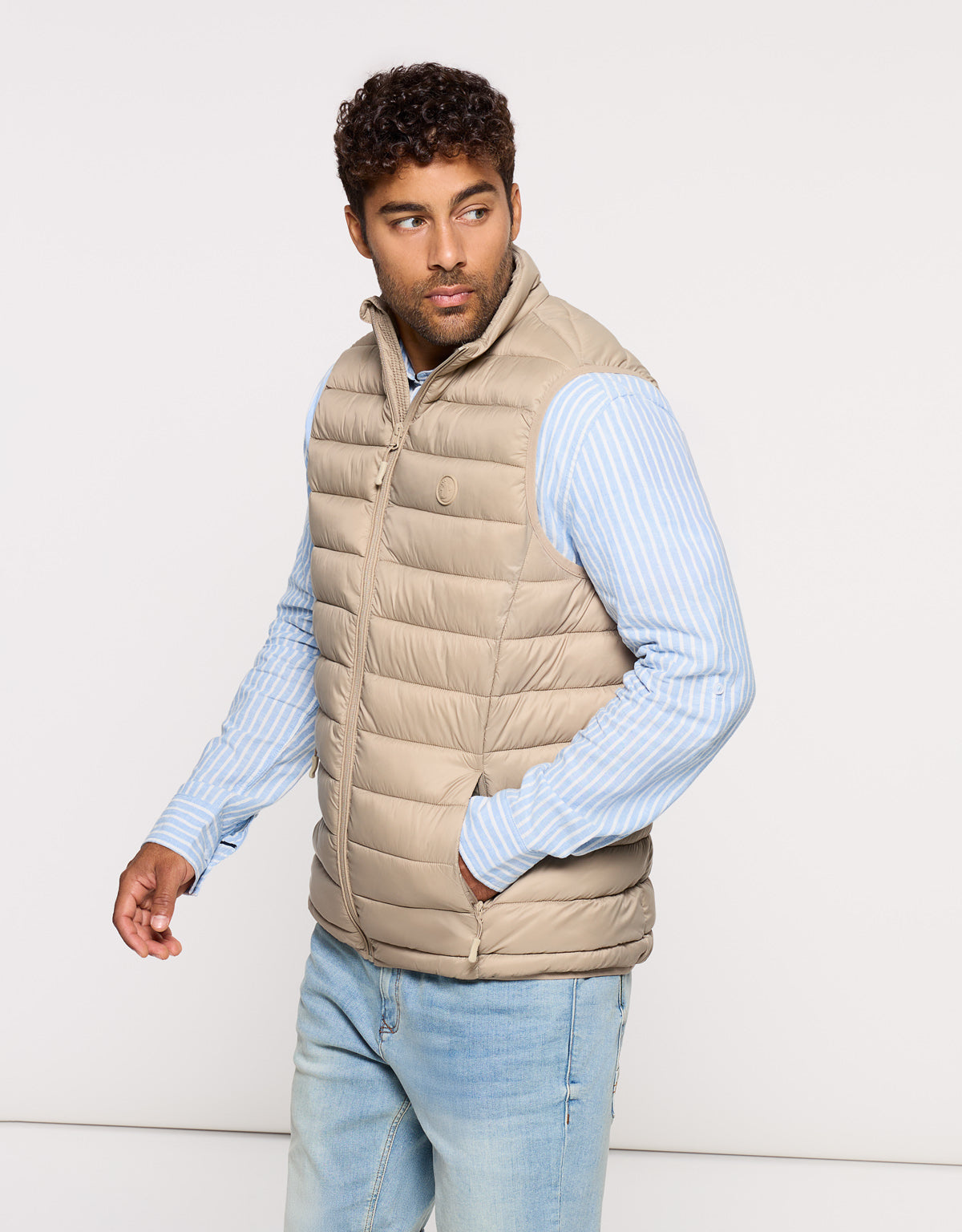Ninbo padded gilet in sand, crafted from soft, lightweight nylon for comfort and style. Its light-toned quilted design provides an elegant and versatile look, perfect for completing your mid-season looks with a sophisticated touch and pairing with contrasting darker garments.