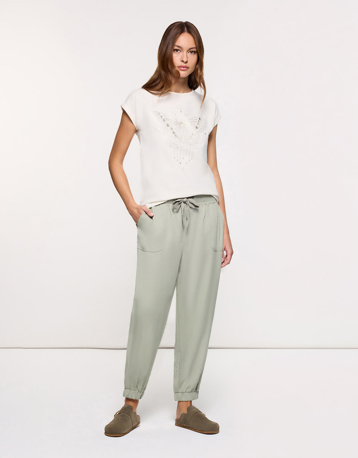 The Kalosa short-sleeved cotton T-shirt stands out for its soft beige hue and delicate butterfly print. Ideal for casual looks with a feminine touch.