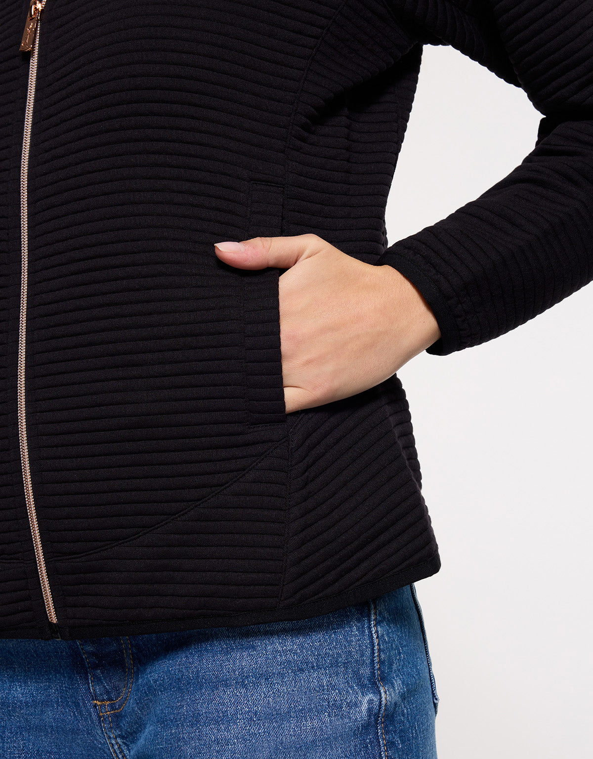 The Tigiana jacket in black is a modern and comfortable piece. Its ribbed fabric and metal zipper closure add a flattering touch. Perfect for pairing with jeans for a casual yet elegant look.