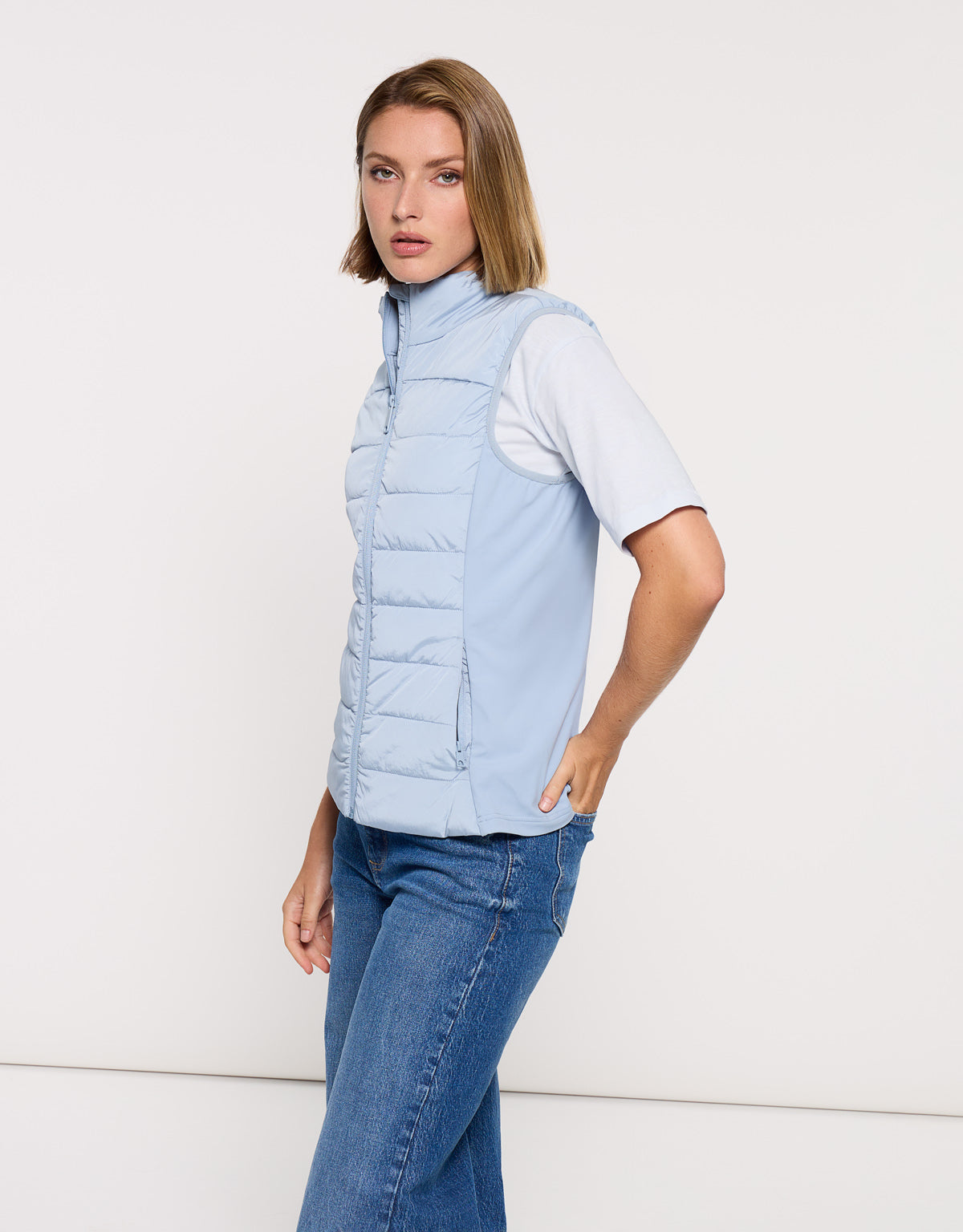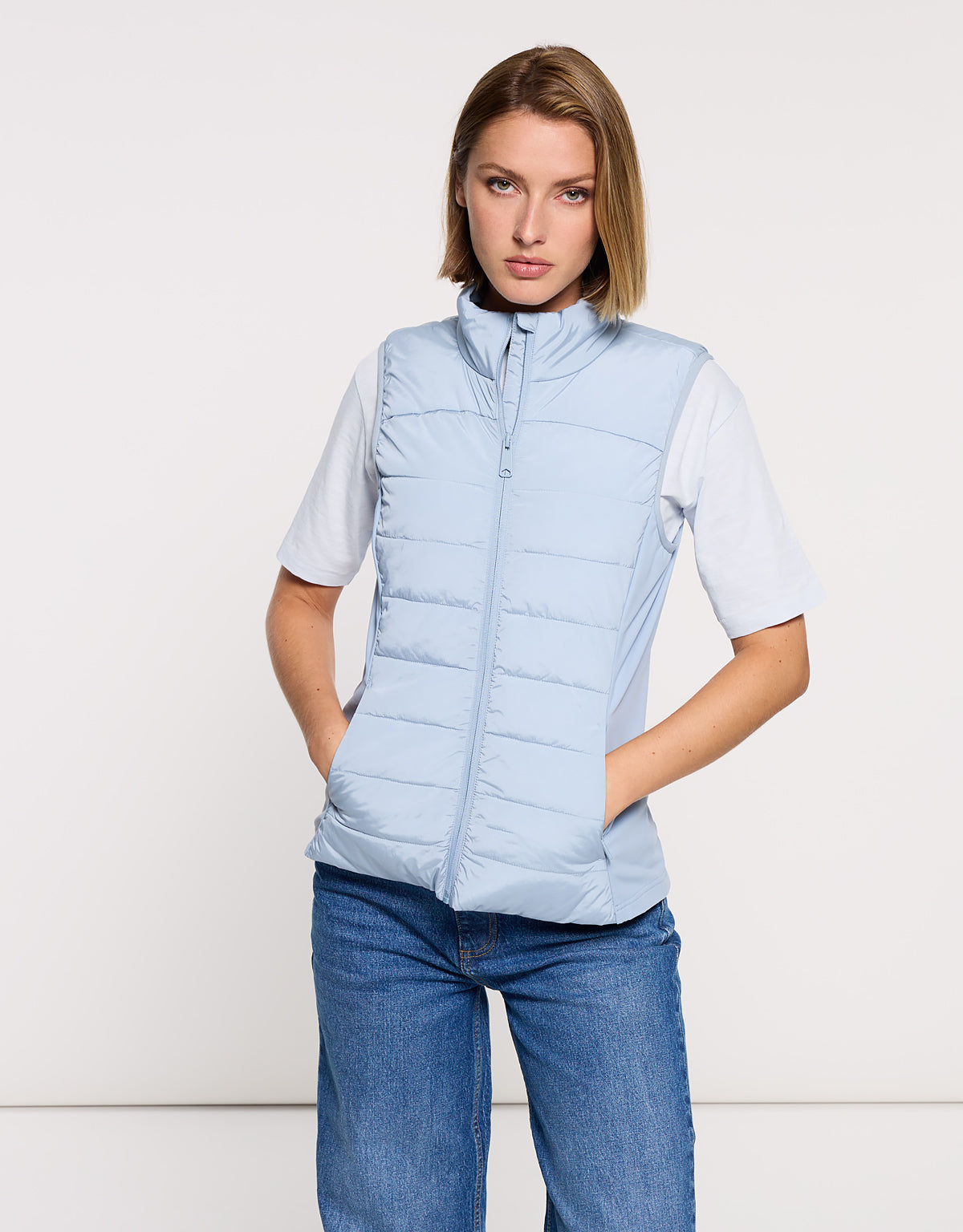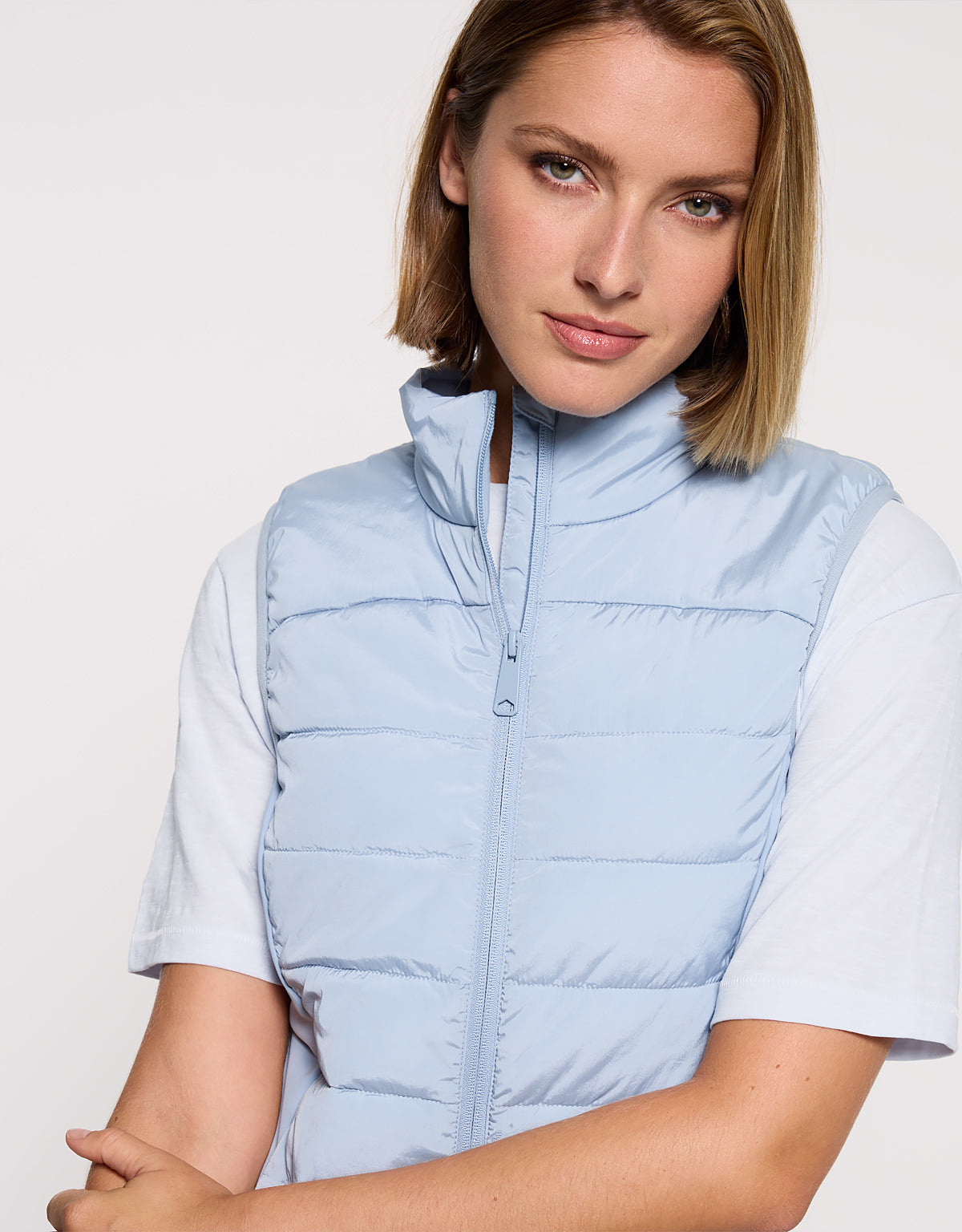 Efebita gilet in sky blue, made of quilted nylon for lightness and warmth. Its modern and versatile design is ideal for transitional days, pairing easily with other seasonal colors.