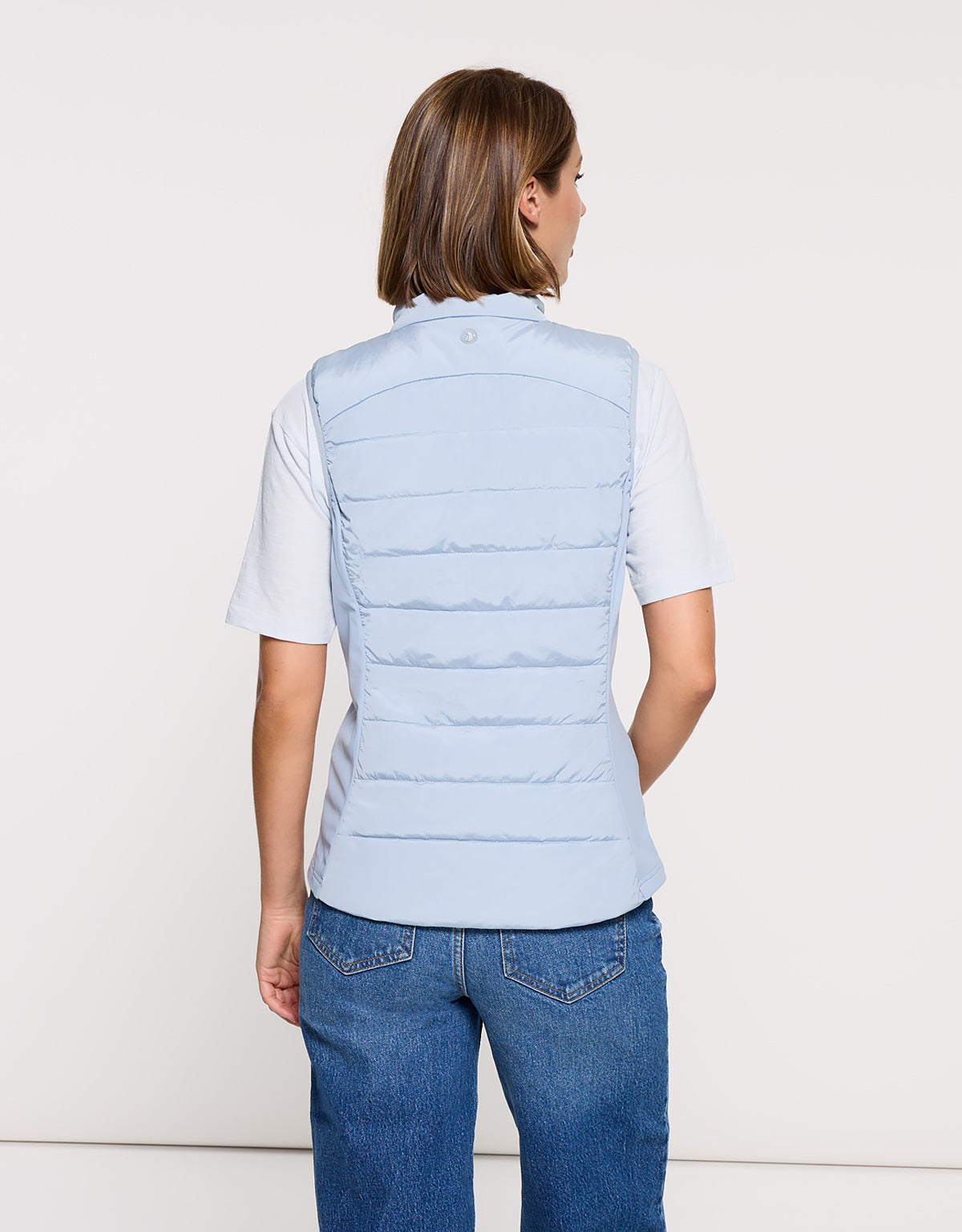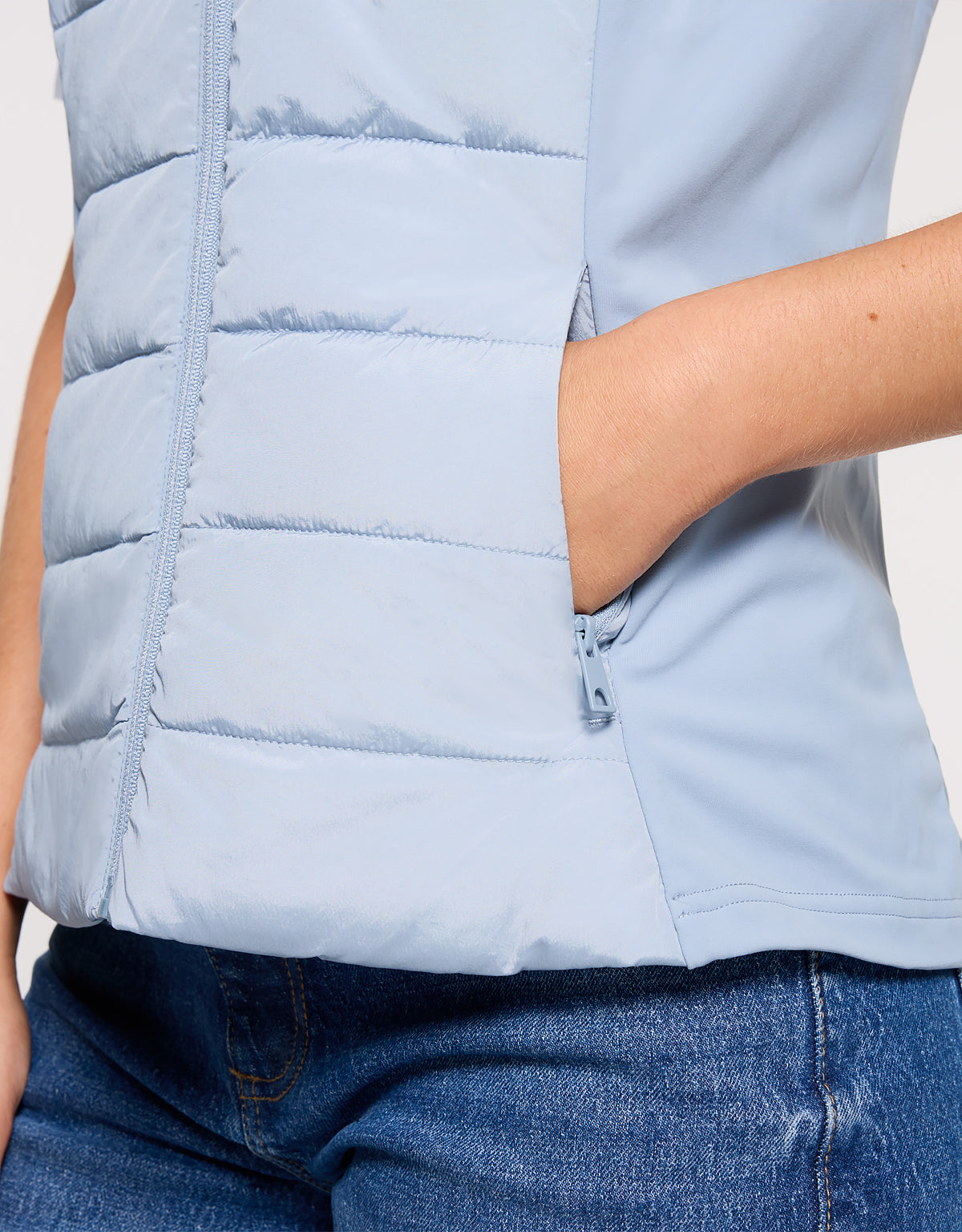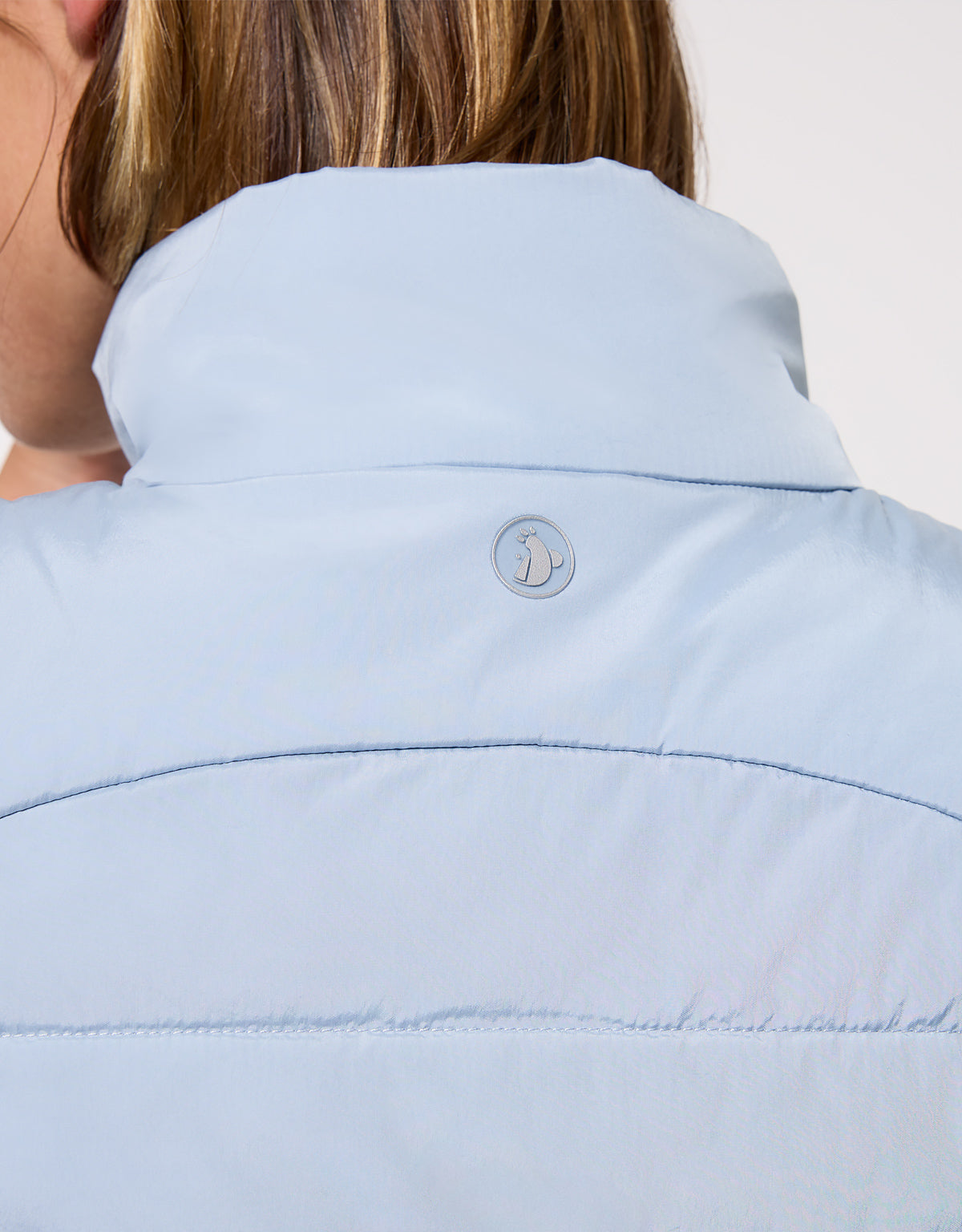 Efebita gilet in sky blue, made of quilted nylon for lightness and warmth. Its modern and versatile design is ideal for transitional days, pairing easily with other seasonal colors.