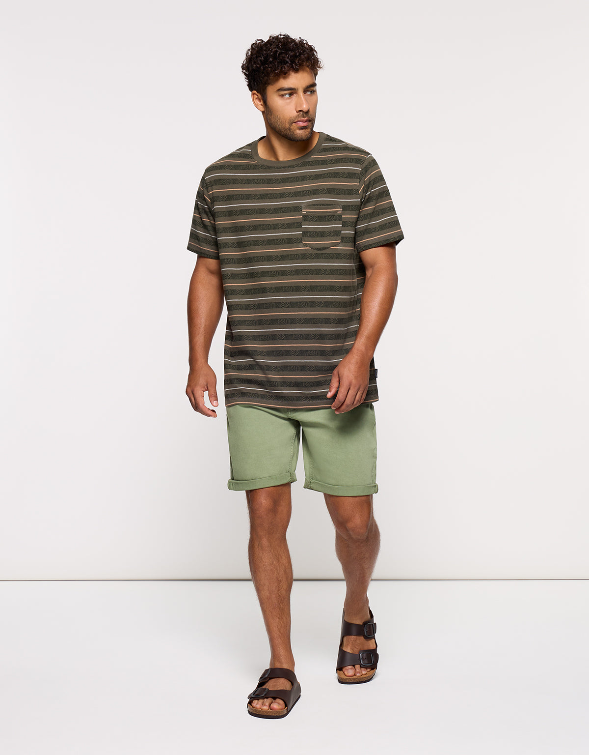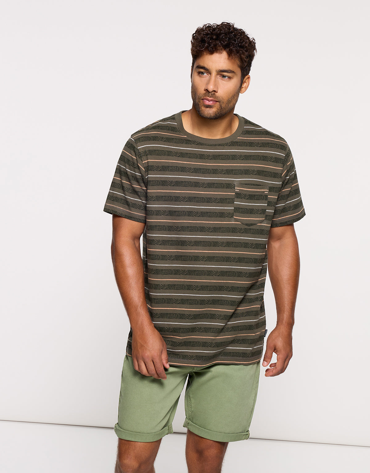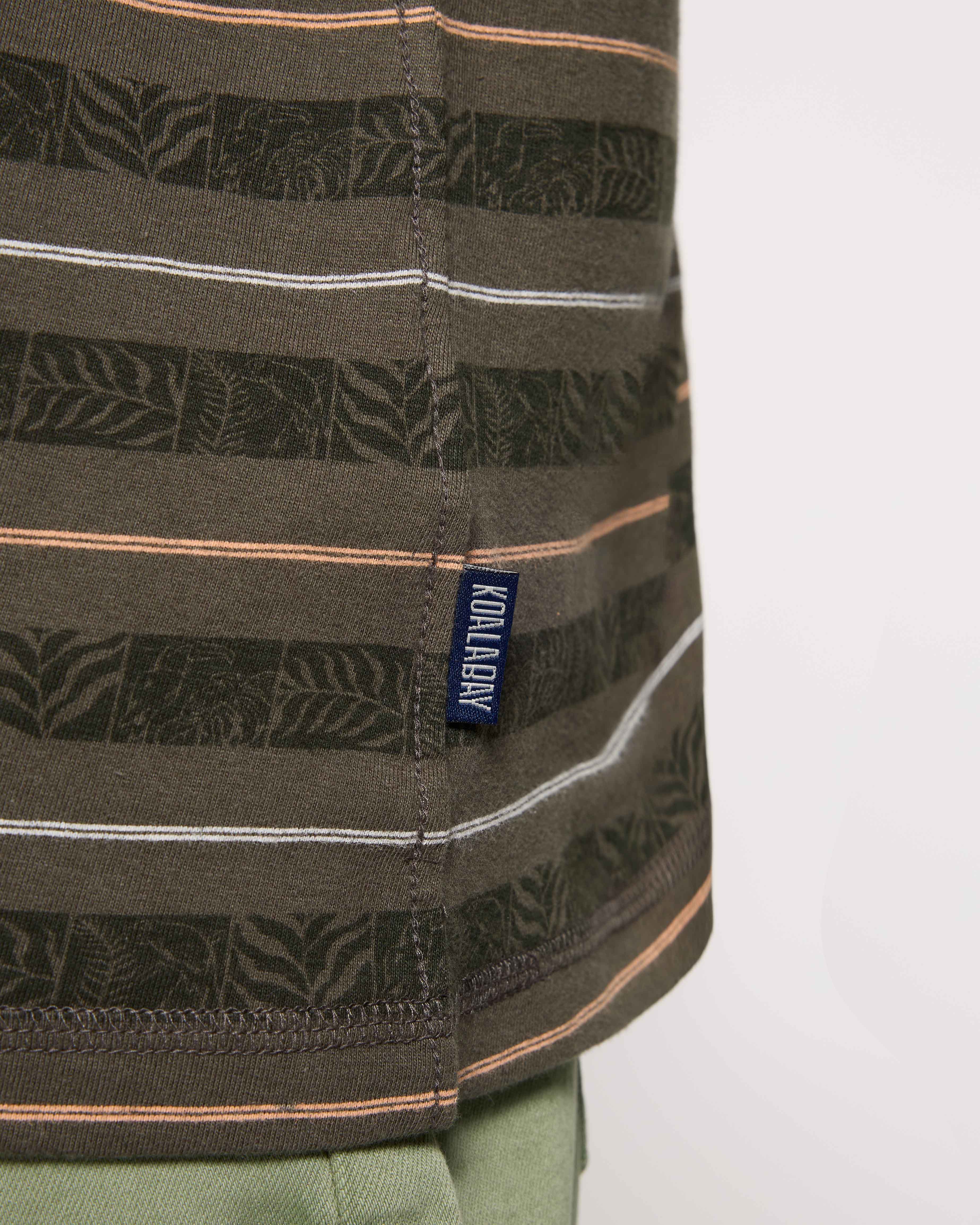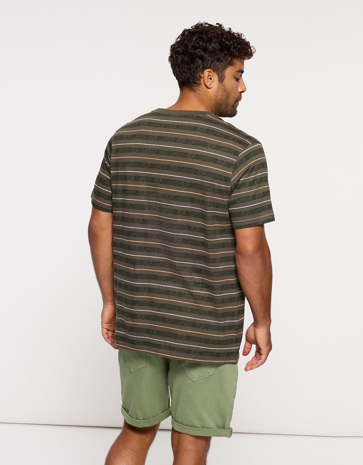 The Iomy khaki short-sleeved cotton T-shirt stands out for its comfort and softness. Its greenish striped design makes it a versatile piece, perfect for a casual and relaxed look.