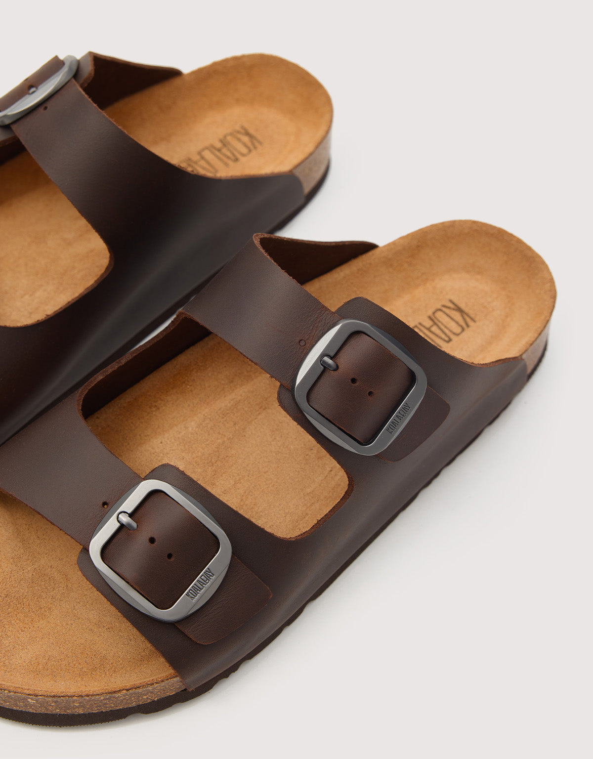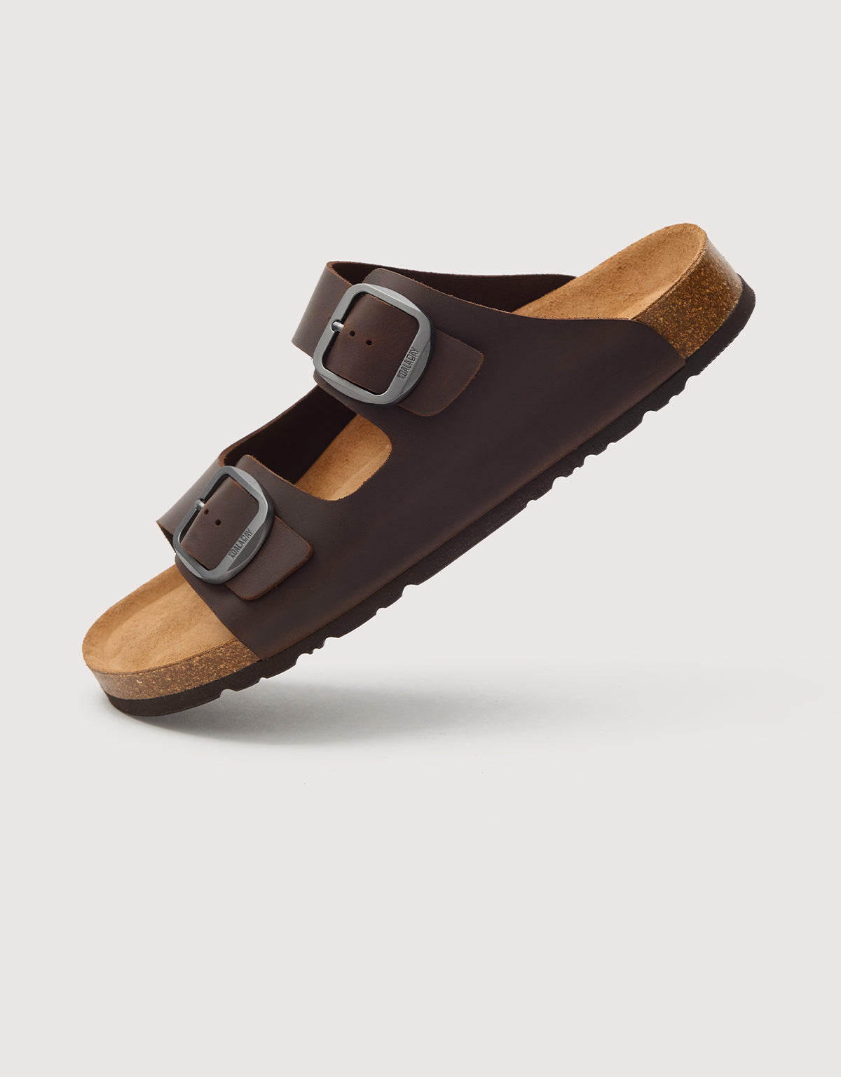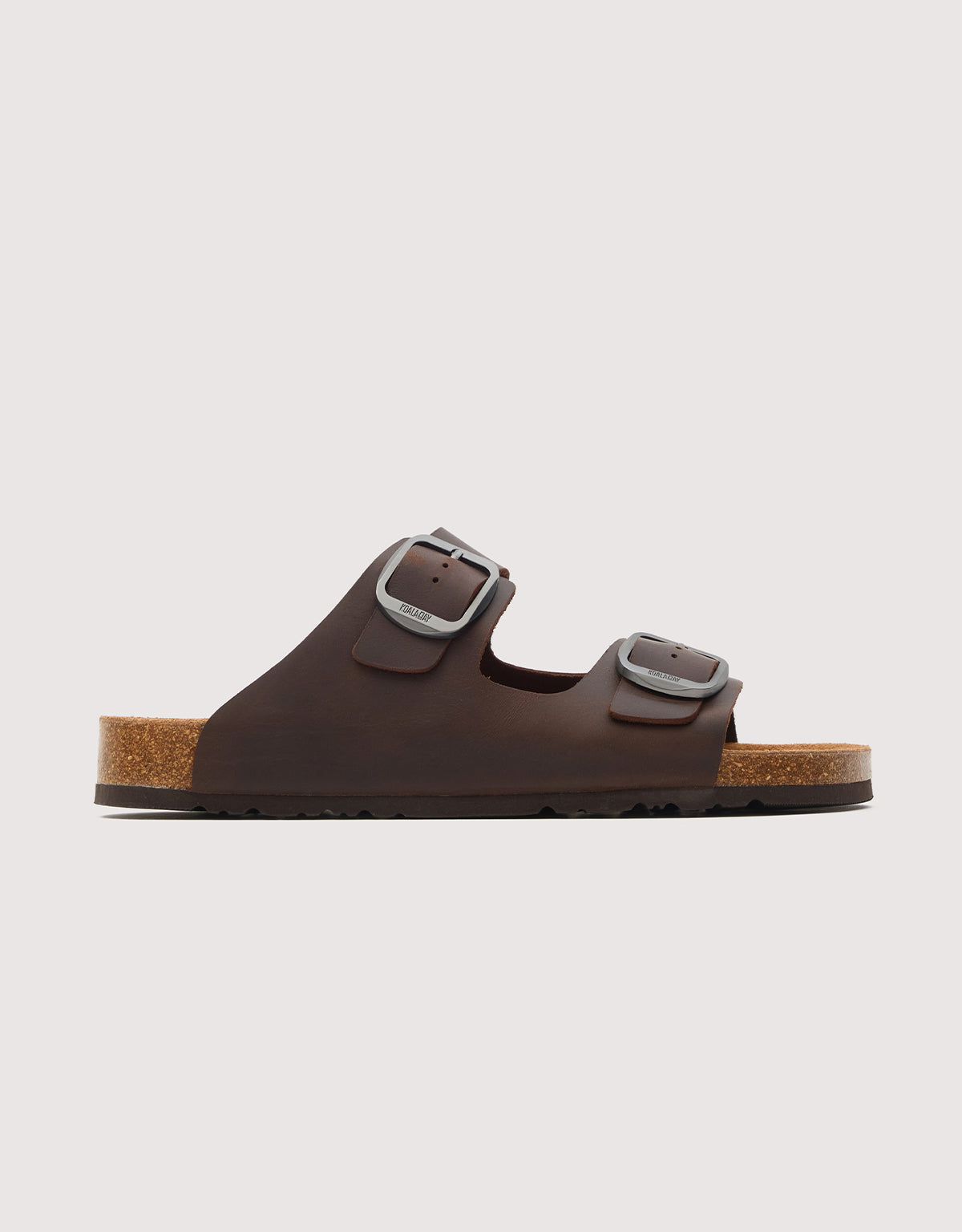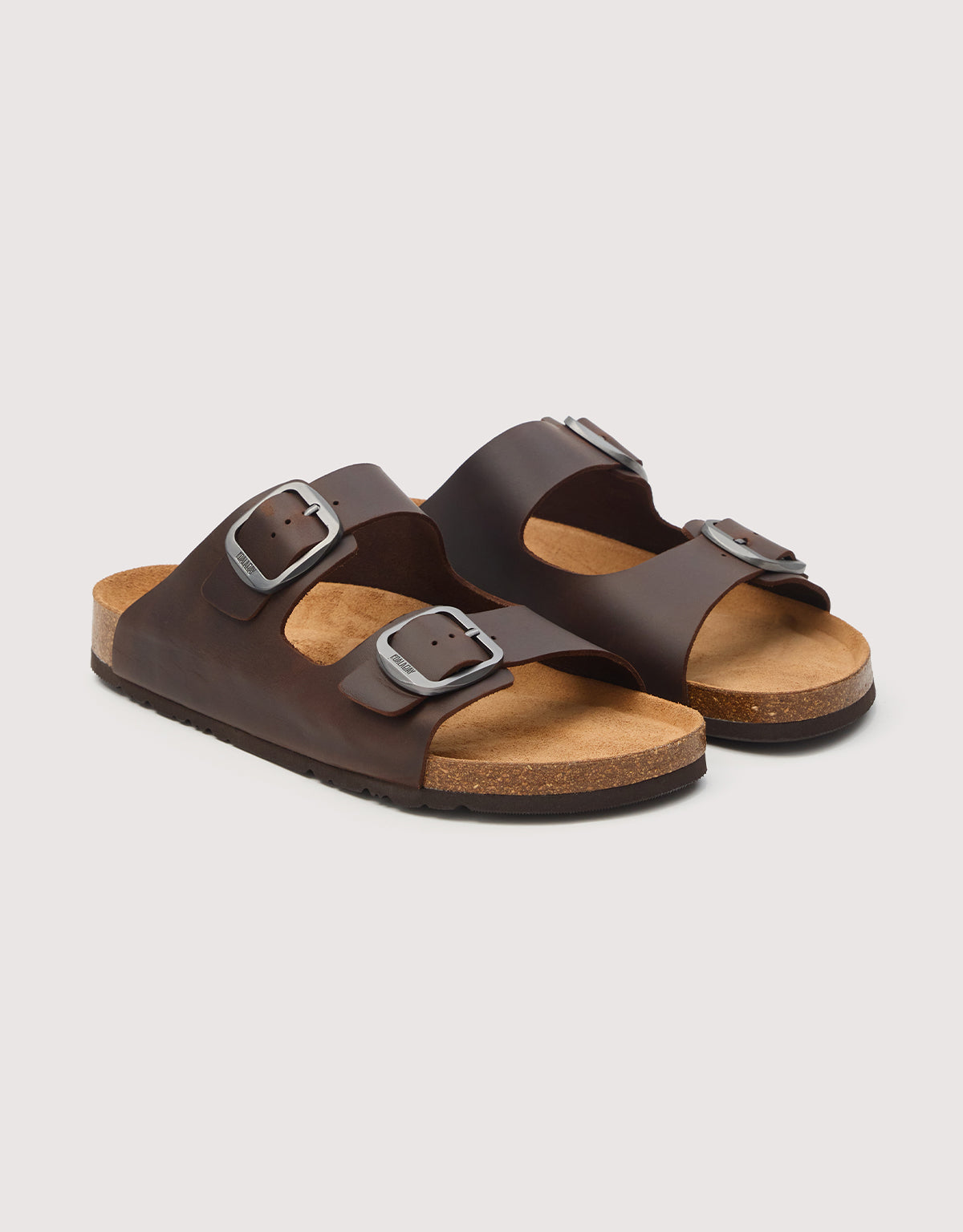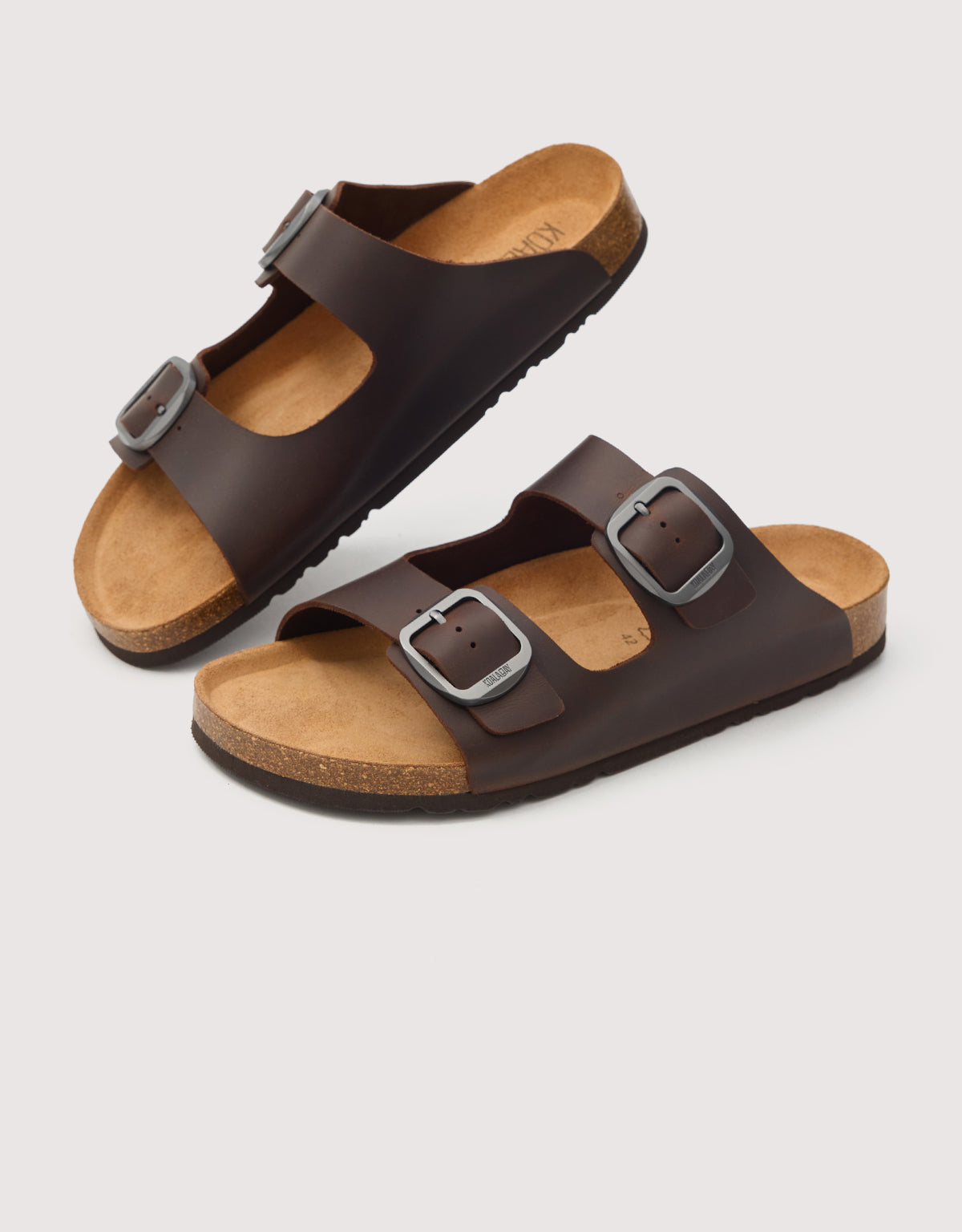 Brown bio sandal with a double adjustable buckle, an anatomical cork insole that adapts to the shape of the foot, and a non-slip sole, offering comfort and casual style for everyday wear.
