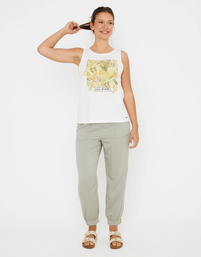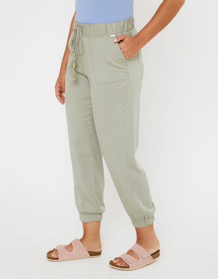 High-waisted pants with adjustable elastic waistband with lace-up details. Marked front pockets. Hem finished with elastic cuff.