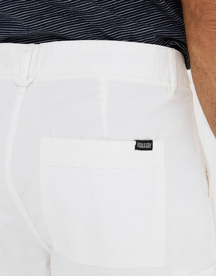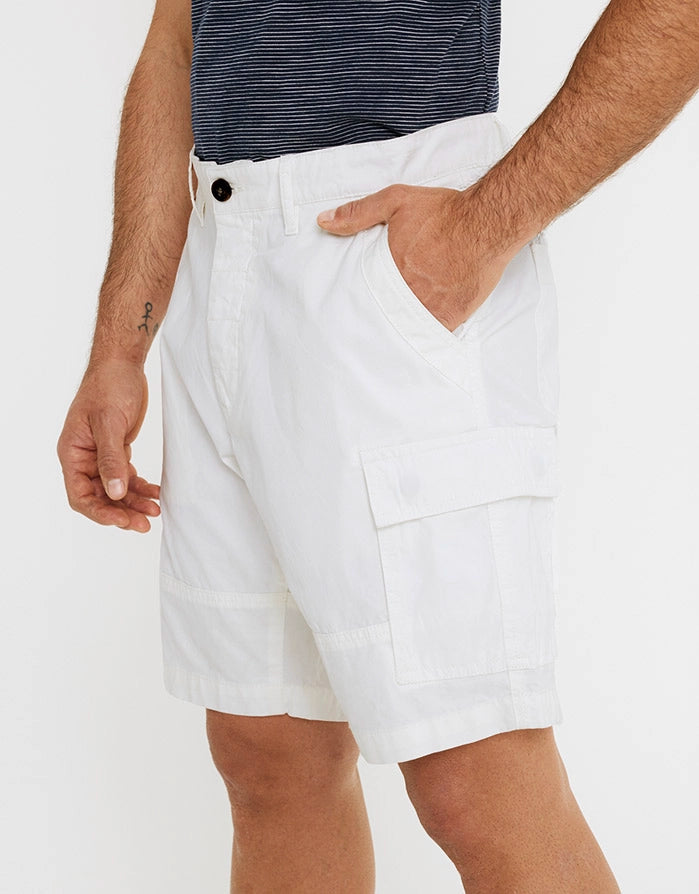 Short cargo en coton. Cinq poches. Application de poches plaquées à rabats sur les jambes. Fermeture à glissière et bouton sur le devant.