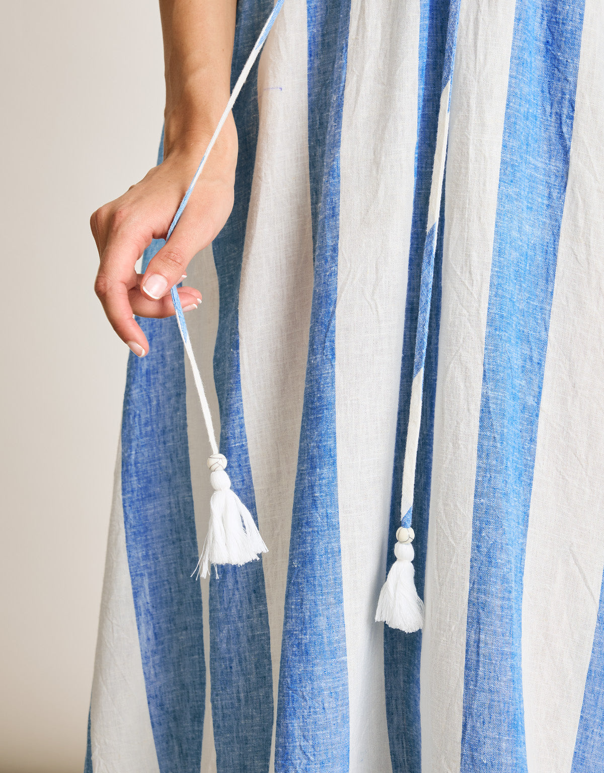 La robe longue bleue Marilo allie élégance et confort dans un style estival. Ses rayures verticales bleues et blanches flattent la silhouette avec une touche méditerranéenne. Son tissu léger et sa coupe fluide la rendent idéale pour les journées plus chaudes. Portez-la avec des sandales pour un look décontracté et sophistiqué.