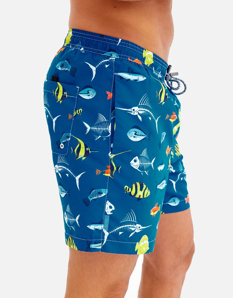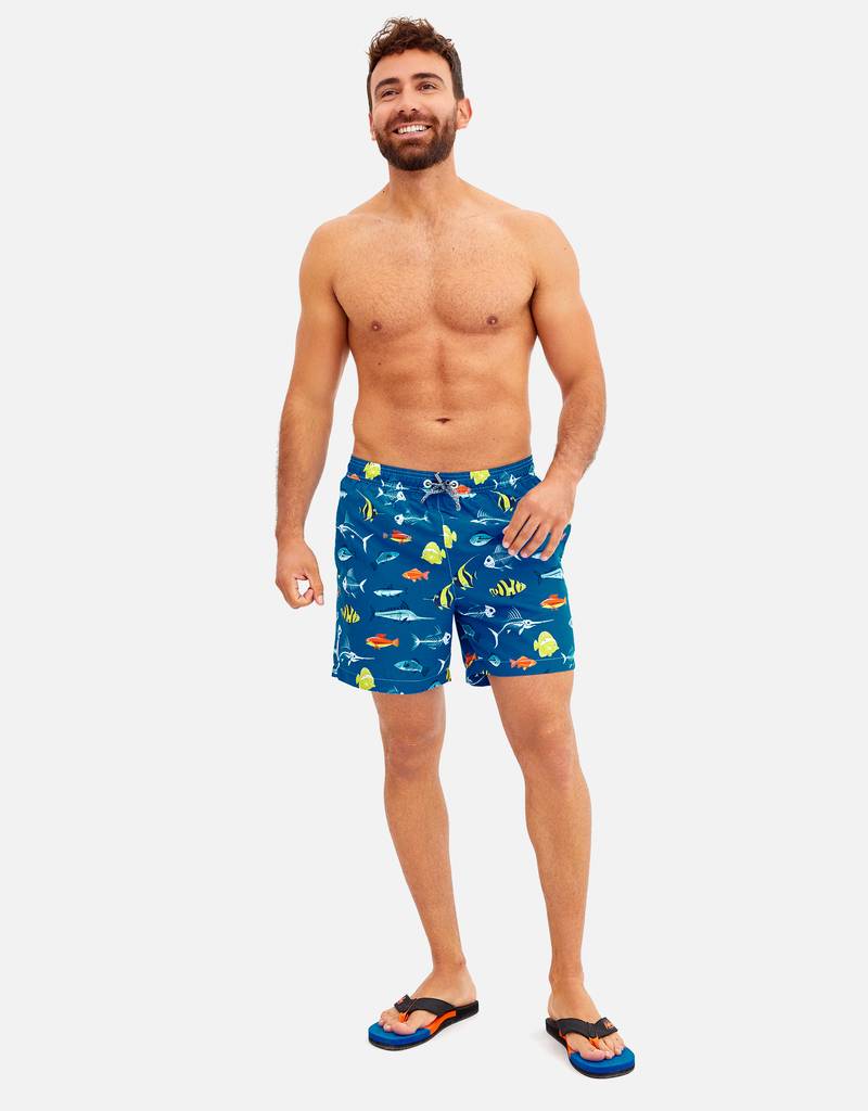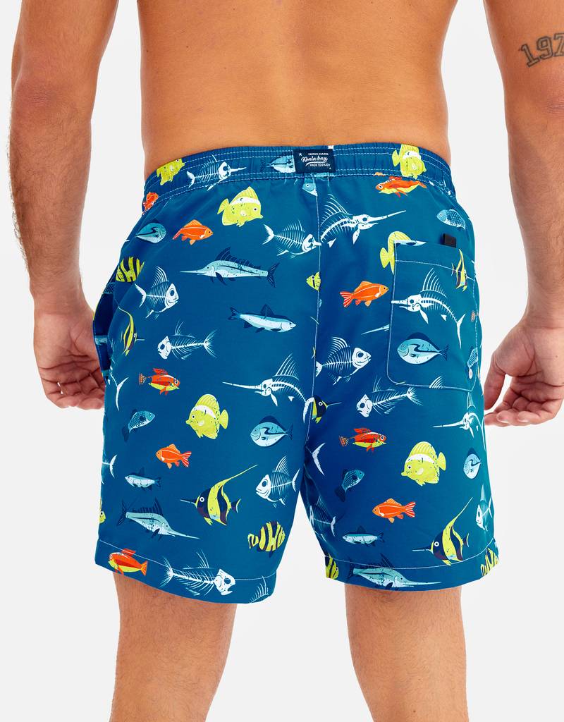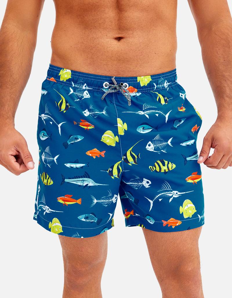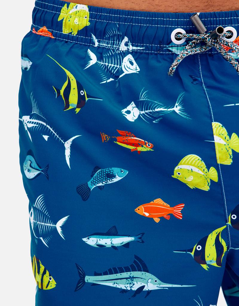 Maillot de bain bleu avec un imprimé original de poissons colorés. Ce modèle a une coupe régulière avec des poches en microfibre, ce qui vous apportera plus de confort et de fraîcheur, ainsi qu'un séchage rapide, idéal pour passer la journée à la plage ou à la piscine pendant les journées ensoleillées de l'été. Composition : 100% Microfibre.