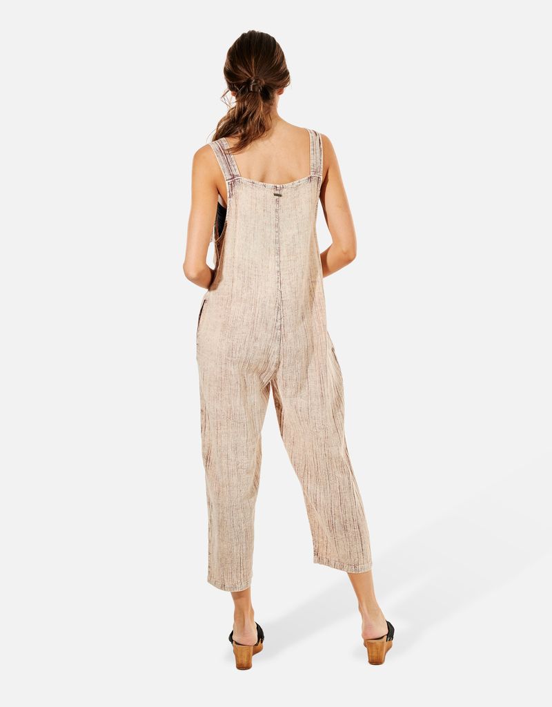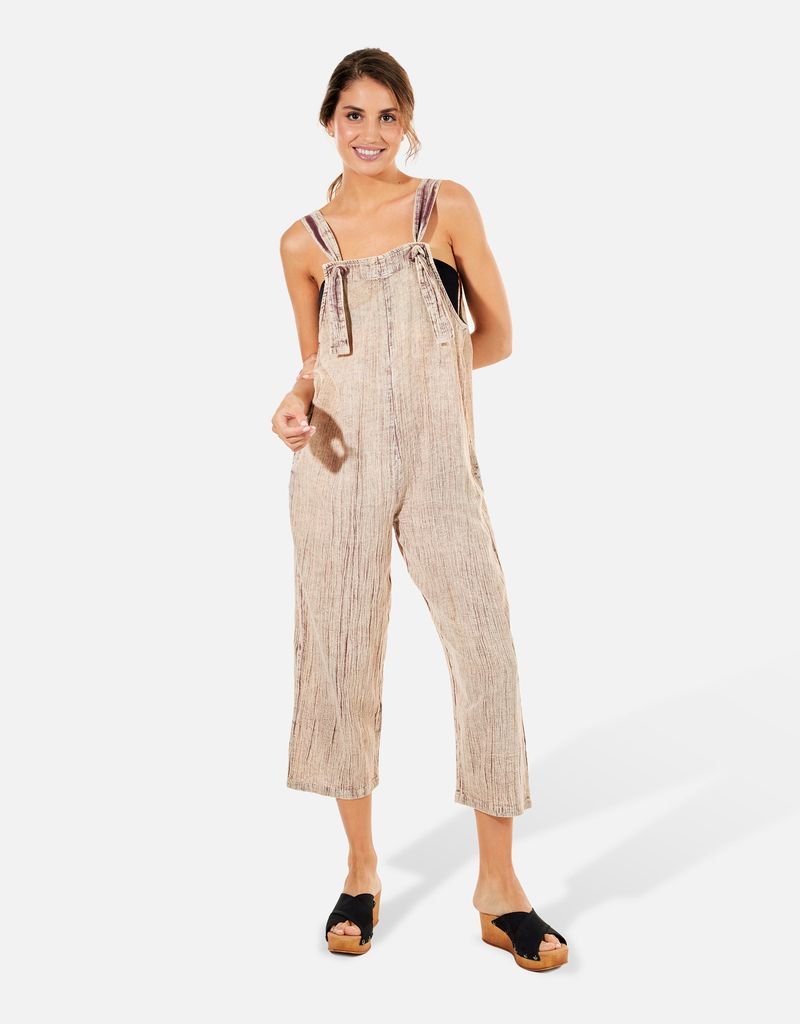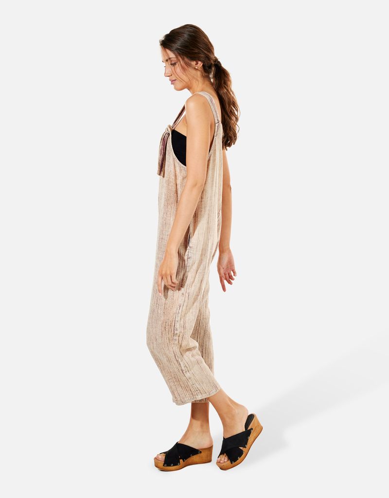 Longue combinaison beige de la nouvelle collection femme en coton et lin doux et léger. Ce modèle sera confortable et facile à combiner. Il est idéal pour vos projets décontractés du printemps et de l'été.